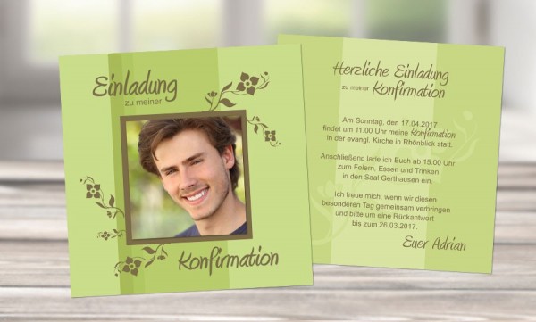 Die Einladung zur Konfirmation ist ein wichtiger Teil der Vorbereitung der Feier Sie dient aber nicht nur der Organisation, sondern eine schön gestaltete Konfirmationseinladung weckt auch Vorfreude auf das Familienfest, welches meist im Anschluss an die kirchliche Zeremonie ausgerichtet wird. Vorlagen für Einladungskarten zur Konfirmation – online selbst gestalten Eine Vorlage für Einladungen zur Konfirmation für Mädchen und Jungen bieten wir auf dieser Seite In unserer Schnellansicht auf der jeweiligen Unterseite finden Sie viele Ideen für die Einladungskarten zur Konfirmation Sie haben die Möglichkeit aus unseren Mustern Ihr Lieblingsexemplar zu wählen und mit eigenem. Die Einladung zur Konfirmation ist ein wichtiger Teil der Vorbereitung der Feier Sie dient aber nicht nur der Organisation, sondern eine schön gestaltete Konfirmationseinladung weckt auch Vorfreude auf das Familienfest, welches meist im Anschluss an die kirchliche Zeremonie ausgerichtet wird.